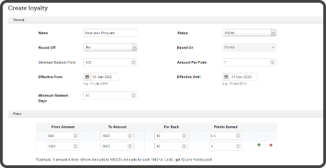 Create flexible loyalty programs based on points or amount and decide your equivalent redemption value to the loyalty points or amount earned by your customers on different slabs also based on the margins you make from the products.