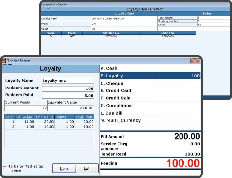Create loyalty cards based on your own format to issue to your customers or even sell them as a membership card. Redeem loyalty points during the billing by scanning loyalty cards or even by OTP verification by triggering the OTP automatically from the system itself for secured redemption and faster checkouts.